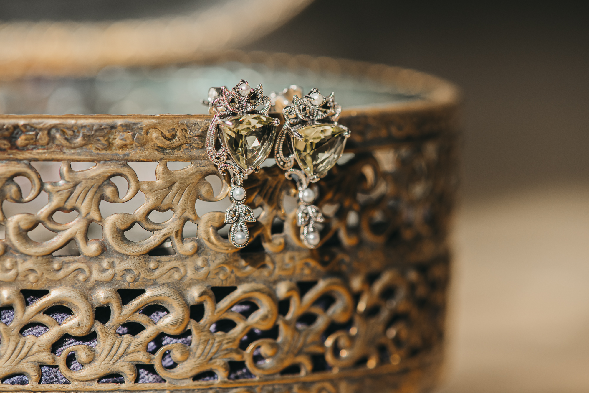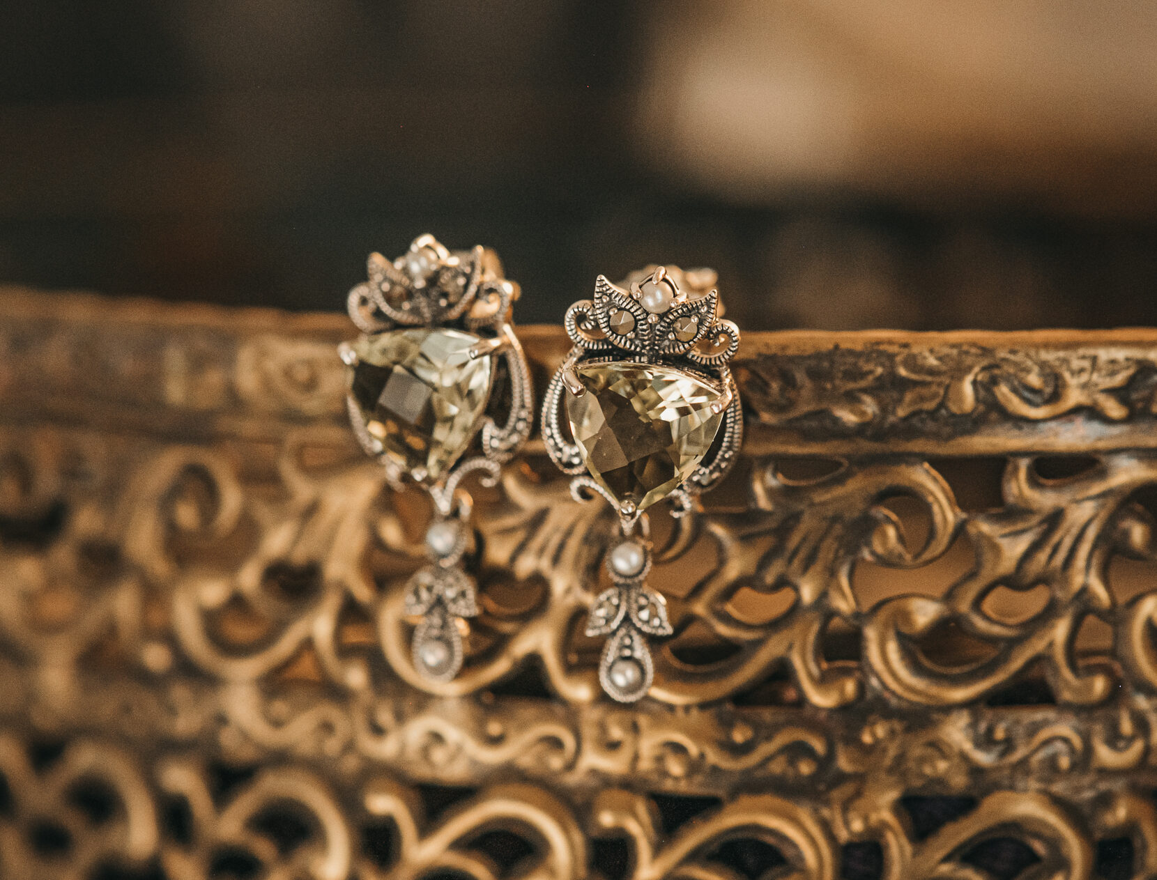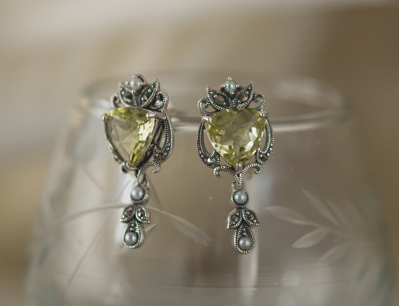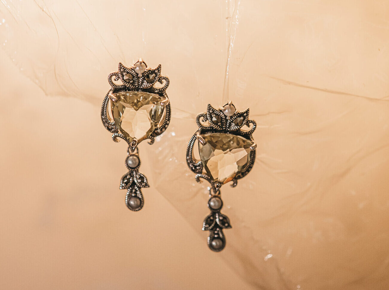 Pendientes realizados en plata, marcasitas, perlitas de agua dulce y cuarzo limón.