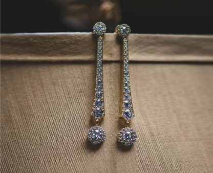 Estos pendientes, de marcado estilo Art Déco, están realizados en plata bañada en oro y rinden homenaje a la sofisticación geométrica y al brillo elegante de los años 20. Su diseño estructurado incorpora un delicado engaste de circonitas que aportan luz y equilibrio visual. Tanto en la cabeza como en los rosetones finales, dos moissanitas centellean con gran intensidad, convirtiendo esta joya en una sinfonía de destellos refinados.