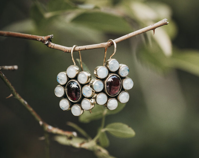 Pendientes en vermeil con piedra luna y granate. Inspirados en los pendientes del cuadro ¨Venere e Marte¨ de Botticelli