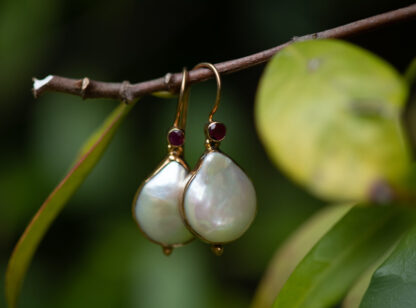Pendientes en plata dorada con perla de agua dulce barroca y pequeños rubíes. Al tratarse de una perla de agua dulce barroca, cada par de pendientes es único y diferente. Si quieres ver el modelo que tenemos disponible puedes escribirnos por whatsapp al 660116577.