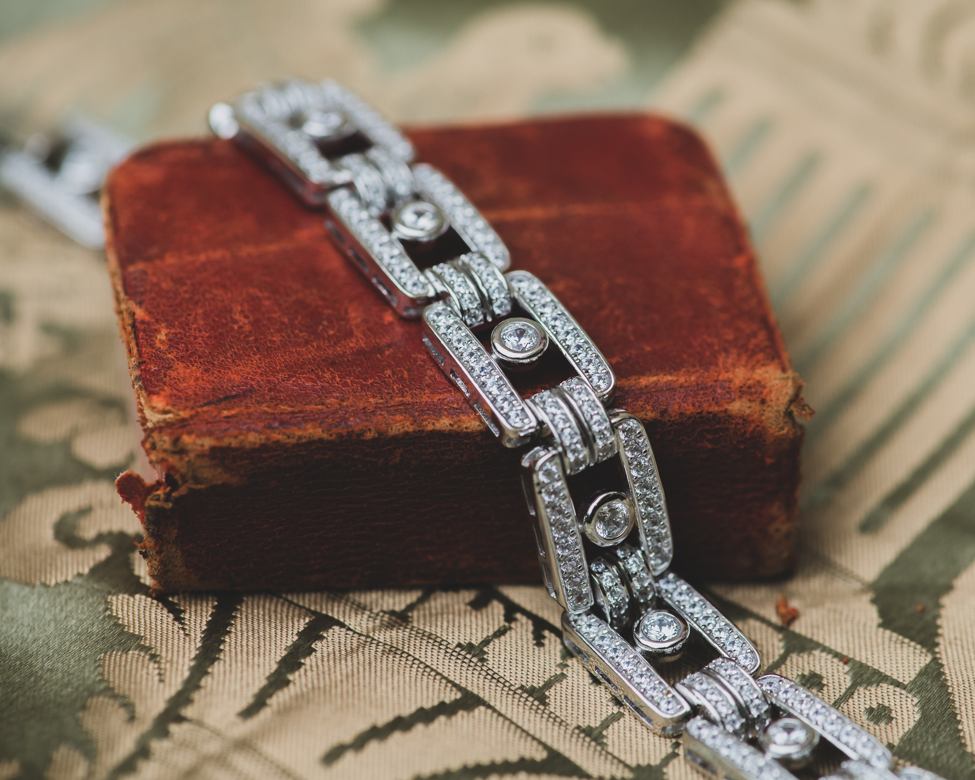 Pulsera de inspiración Art Decó, compuesta por delicados eslabones en plata que dibujan un diseño geométrico y armonioso. Cada eslabón está realzado con circonitas engastadas que capturan la luz con destellos sutiles, evocando el glamour sofisticado de los años 20. Una joya atemporal que aporta elegancia y refinamiento a cualquier ocasión.