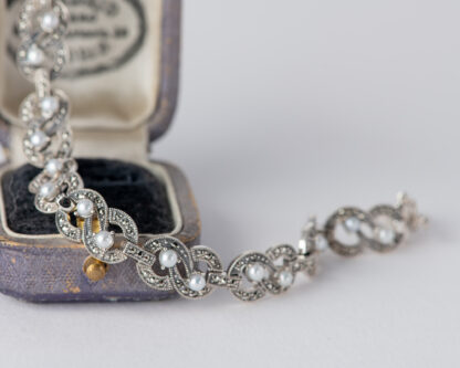 Pulsera realizada a mano en plata con marcasitas y perlas de agua dulce.